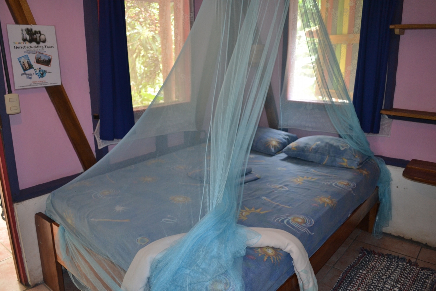 Brigitte Cabinas is a quiet and relaxing spot on the shores of the Caribbean in Cahuita, Costa Rica.  With surfing lessons, horseback riding, jungle tours, and other activities, the friendly owner Brigitte will be sure to find something that fits your fancy.  The cabins are colorful and cozy with ocean-life murals and a sea breeze flowing through the windows.  Each room has a fan and mosquito netting.  The speedy WiFi covers the entire grounds.  An on-site restaurant serves a full spread of classic breakfast options along with local favorites.